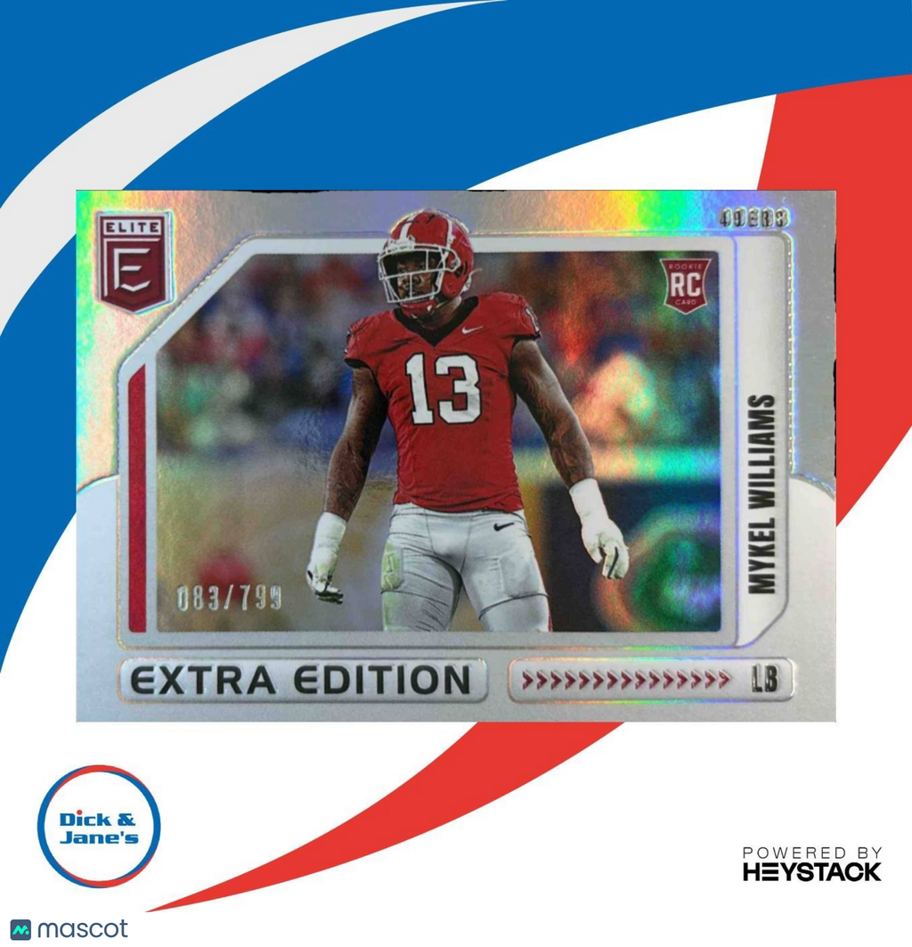 This rare and highly collectible 2025 Donruss Elite Mykel Williams Extra Edition trading card features the rising star from the San Francisco 49ers. With only 799 in existence, this card is numbered 83/799 and is a must-have for any football card collector. Don't miss out on adding this one-of-a-kind card to your collection! Listed With Mascot.