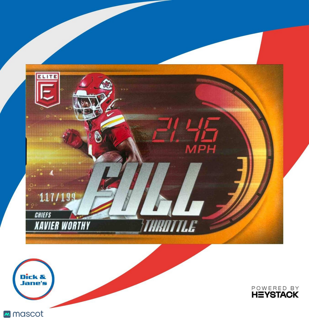 This rare 2025 Donruss Elite Xavier Worthy Full Throttle Orange trading card is a must-have for any NFL collector. Limited to just 199 copies, this card features the dynamic wide receiver from the Kansas City Chiefs. Don't miss out on adding this special edition card to your collection. Listed With Mascot.
