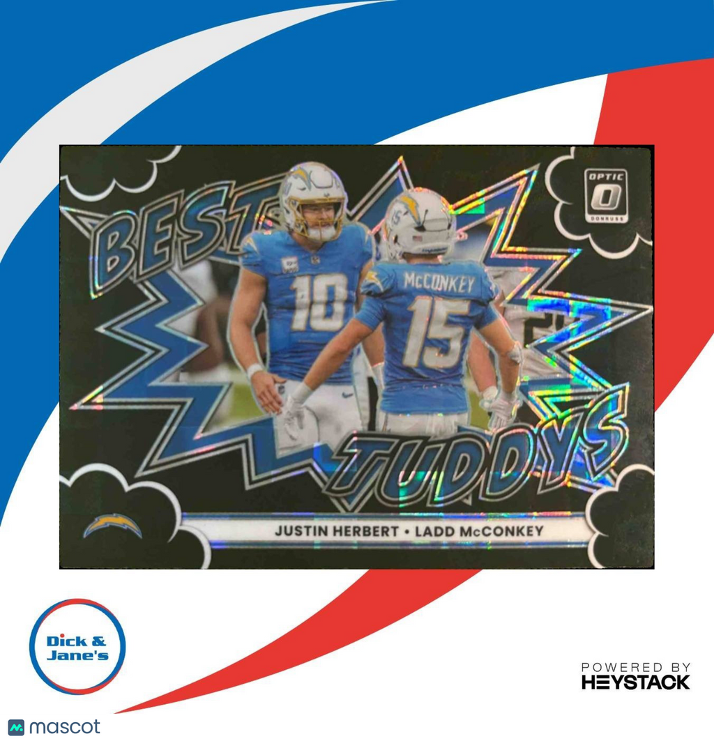 This 2025 Donruss Optic Justin Herbert Ladd McConkey Best Tuddys Black Pandora /149 card is a collector's dream! Featuring two up-and-coming NFL stars, this limited edition card is a must-have for any avid sports trading card enthusiast. Don't miss your chance to own a piece of sports history! Listed With Mascot.