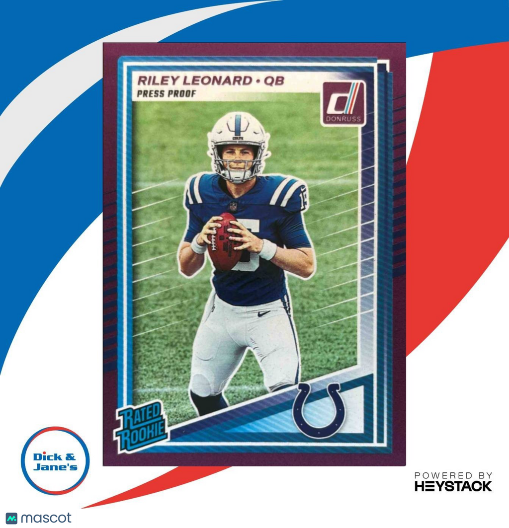The 2025 Donruss Riley Leonard Press Proof Purple #341 RC Indianapolis Colts trading card is a must-have for any NFL collector. Featuring the talented rookie Riley Leonard in his Colts uniform, this card is a rare Press Proof Purple edition. Add this dynamic card to your collection today! Listed With Mascot.