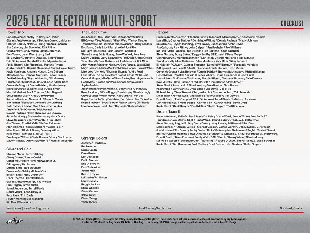 As expected, Leaf Trading Cards continues to deliver excellence in multi-signed collectibles. The 2025 Leaf Electrum Multi-Sport release upholds that tradition-offering some of the most collectible and valuable multi-signed cards in the hobby today, along with new innovations and themes that elevate the Electrum brand even further.