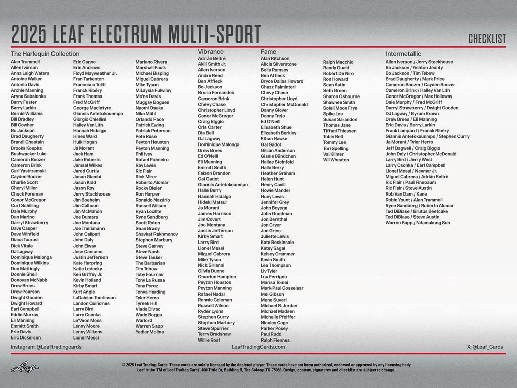 Leaf Trading Cards is excited for the return of Leaf Electrum Multi-Sport! This stunning release showcases Leaf's exclusive Micro-Etch Holo Foil technology, delivering premium visual appeal across every card. The 2025 edition introduces new and exciting themes, including Achromatic and The Harlequin Collection, adding fresh depth and creativity to the multi-sport lineup.