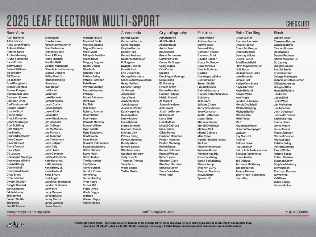 Collectors can look forward to incredible chase opportunities in 2025 Leaf Electrum Multi-Sport! Look for Double Front Multi-Signed cards featuring a fantastic mix of talent across multiple sports- crafted to deliver an exceptional high-end collecting experience.