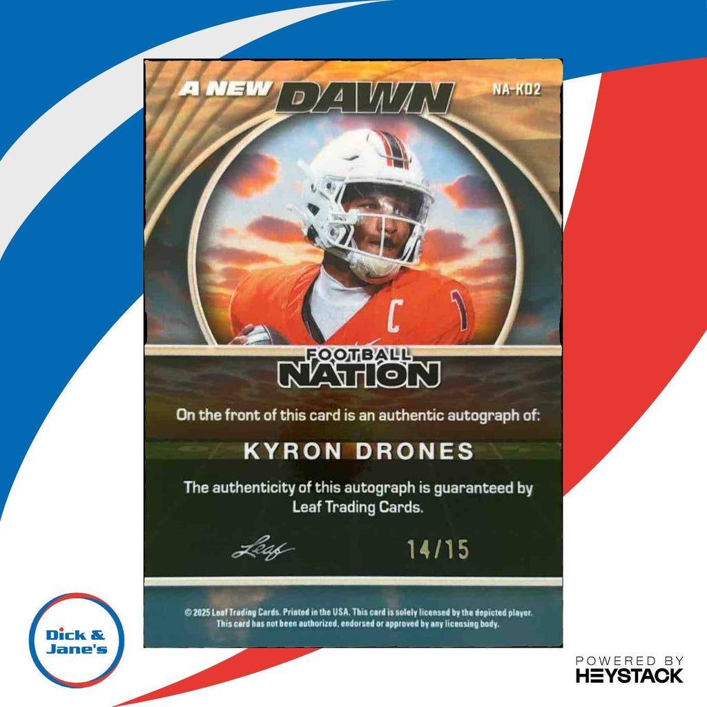 The 2025 Leaf Football Nation Kyron Drones A New Dawn Auto Prismatic Silver trading card is a limited edition collectible with only 15 made. This rare card features an autograph by Kyron Drones, making it a must-have for any football card collector. Don't miss out on adding this unique piece to your collection! Listed With Mascot.