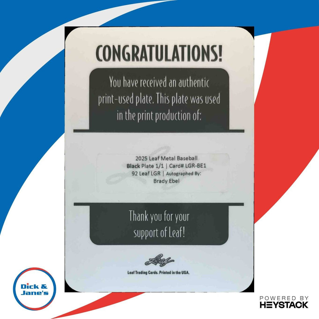 Rare and highly collectible 2025 Leaf Metal Brady Ebel trading card. This one-of-a-kind LGR Printing Plates Black 1/1 features an authentic autograph from the player himself. A must-have for any serious sports card collector. Grab this unique piece of memorabilia before it's gone! #LGR-BE1Auto Listed With Mascot.