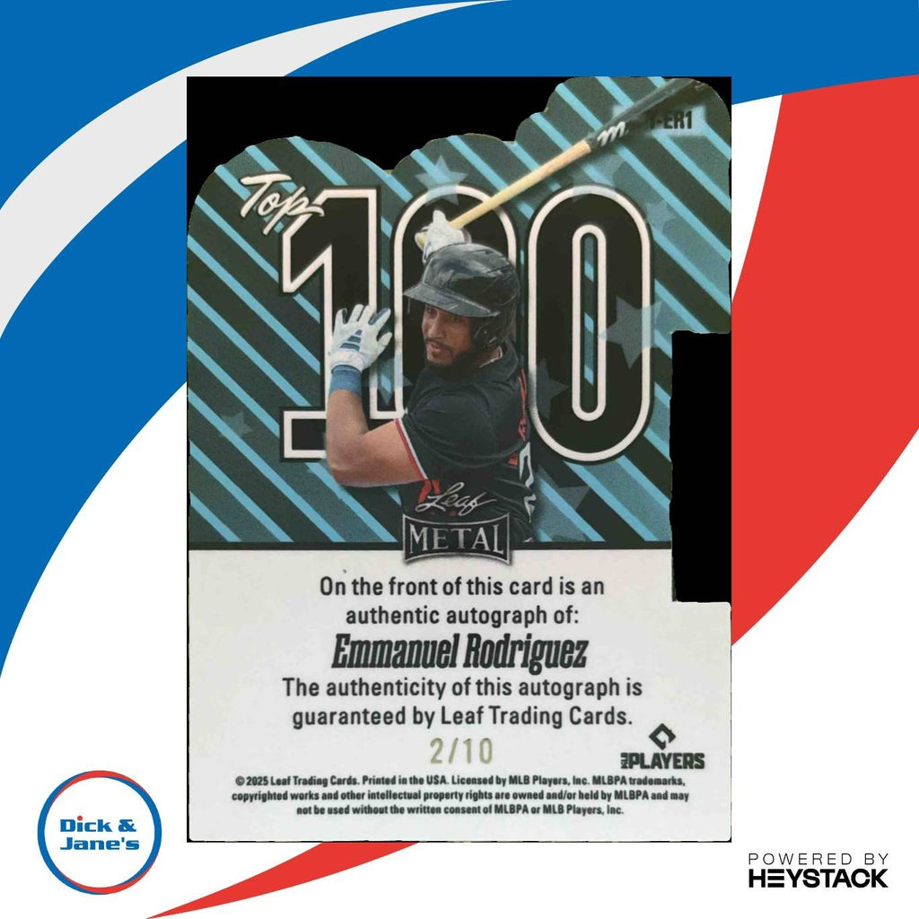 This rare 2025 Leaf Metal Emmanuel Rodriguez trading card features a stunning Prismatic Purple design and is numbered 2 out of 10. It also includes an authentic autograph from the rising star. A must-have for any sports card collector or fan of Rodriguez. Get it before it's gone! #T-ER1 Autograph Listed With Mascot.