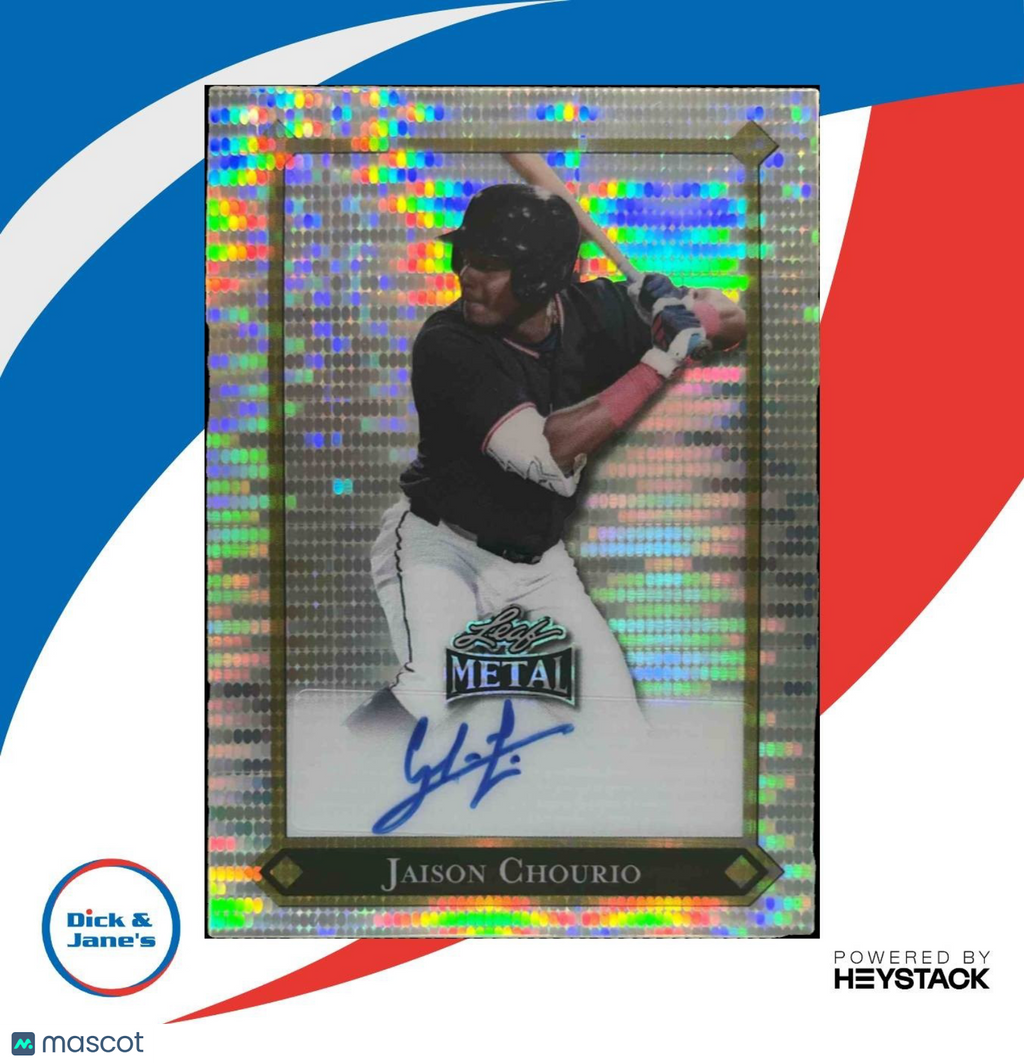 Rare 2025 Leaf Metal Jaison Chourio sports trading card featuring a unique LGR Pulsar Silver design. Limited to only 10 copies, this card is number 2 in the series and includes an authentic autograph from the player. A must-have for any sports card collector or fan of Jaison Chourio. Listed With Mascot.