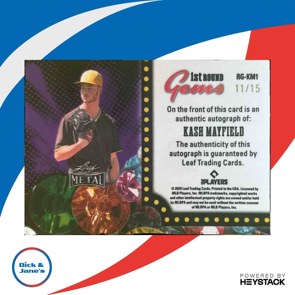 2025 Leaf Metal Kash Mayfield 1st Prospect Round Gems Auto Prismatic Red 11/15 - This rare and collectible sports trading card features an autograph from Kash Mayfield, a promising young talent in the sports world. With only 15 in existence, this card is a gem for any collector or fan. Don't miss out on owning a piece of history! Listed With Mascot.