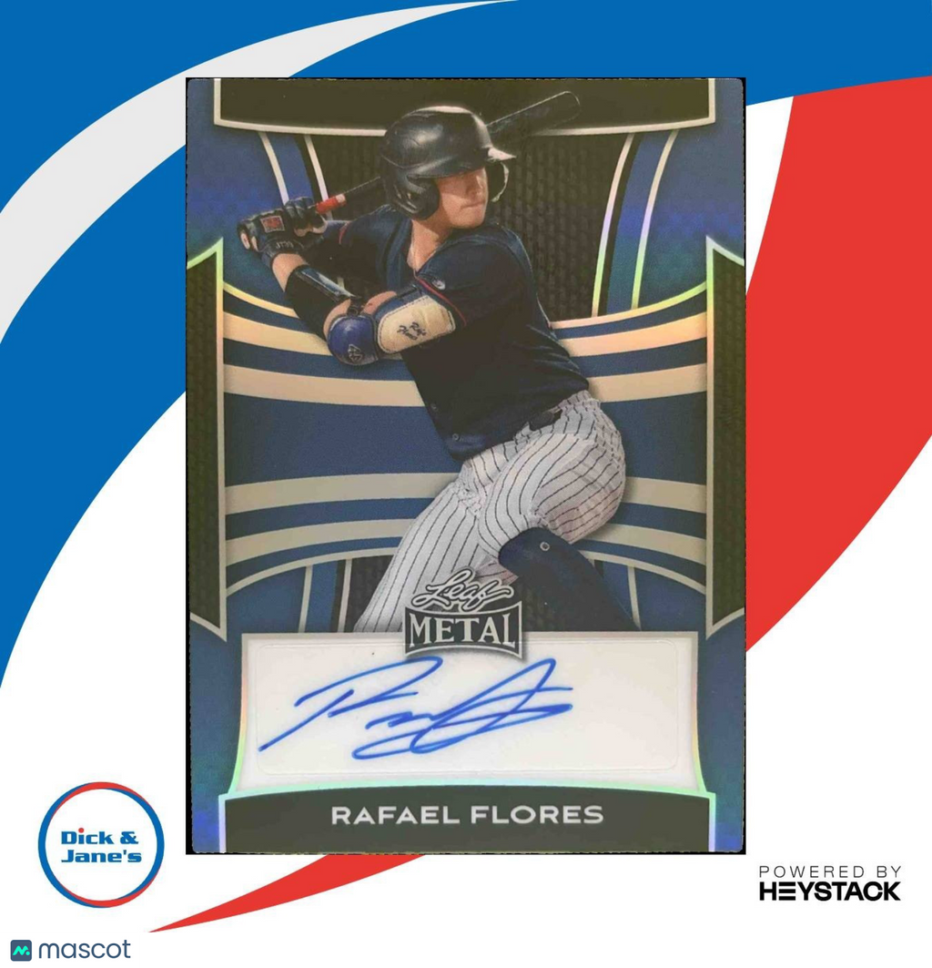 This limited edition 2025 Leaf Metal Rafael Flores Auto Prismatic Blue sports trading card is a must-have for any collector! With a rare autograph from the player himself and a low serial number of 5/25, this card is sure to be a valuable addition to your collection. Don't miss out on the chance to own this unique piece of sports memorabilia. Listed With Mascot.