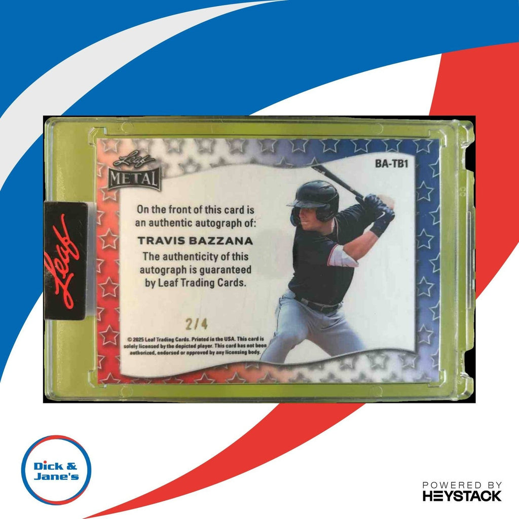 This rare 2025 Leaf Metal Travis Bazzana Auto /4 trading card is a must-have for any collector. Featuring a hand-signed autograph by the player and limited to only 4 copies, this is a truly unique and valuable piece for sports card enthusiasts. Don't miss your chance to own a piece of sports history! Listed With Mascot.