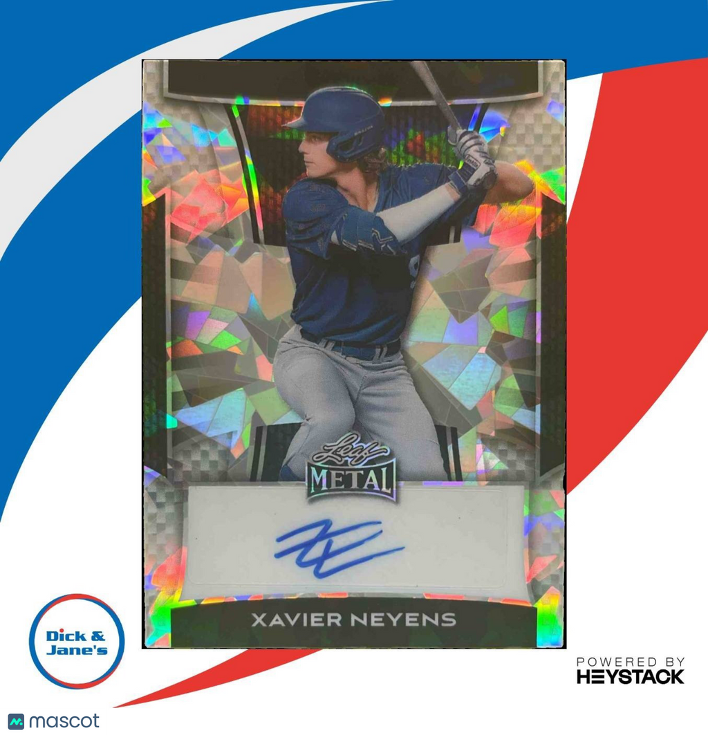 2025 Leaf Metal Xavier Neyens Auto Prismatic /25 trading card featuring a rare autograph from the player. Limited to only 25 copies, this card is a must-have for any sports card collector. Don't miss the chance to own a piece of sports history with this highly collectible item! Listed With Mascot.