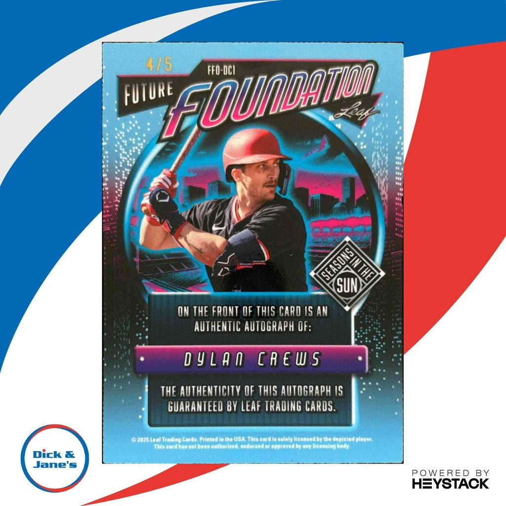 Own a piece of MLB history with this ultra-rare 2025 Leaf Seasons In The Sun Dylan Crews Future Foundation trading card. Limited to only 5 copies with a signature from the future star himself, this collectible is a must-have for any sports card enthusiast. Don't miss out on adding this gem to your collection! Listed With Mascot.