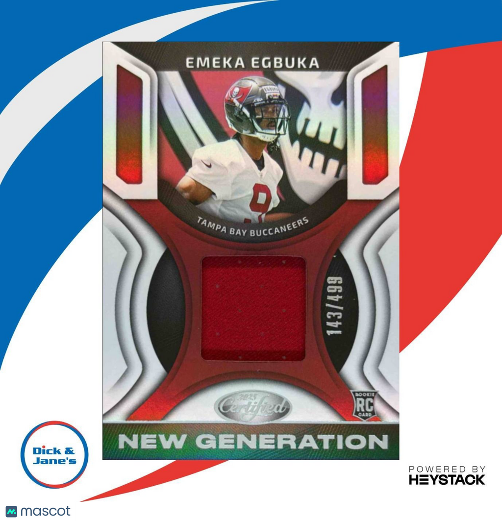Collect this rare 2025 Panini Certified Emeka Egbuka New Generation Jerseys Mirror /499 Buccaneers trading card featuring a game-worn jersey swatch. This MEM RC NFL card is a must-have for any football card collector and is sure to be a valuable addition to your collection. Order now before it's gone! Listed With Mascot.