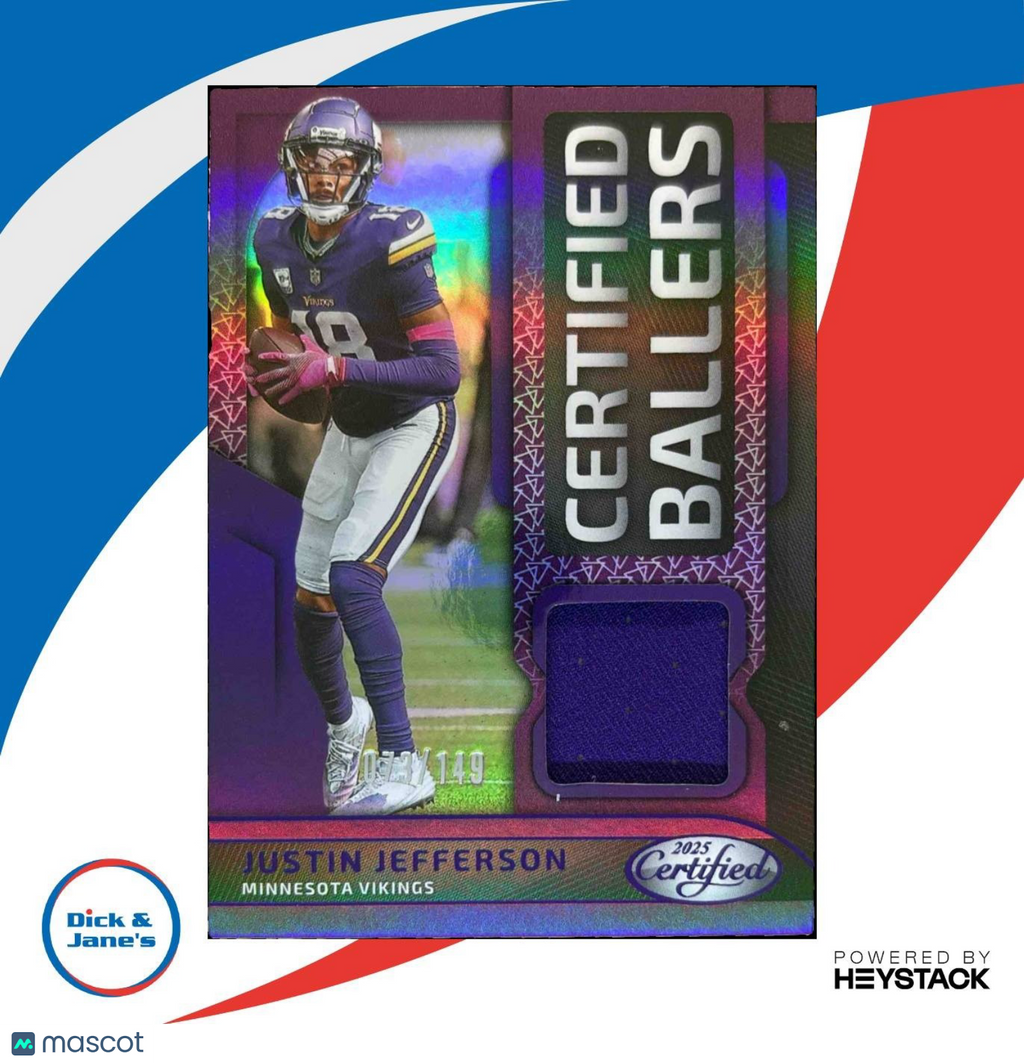 Own a piece of NFL history with the 2025 Panini Certified Justin Jefferson Ballers Mirror Purple card. This limited edition card features a memorabilia swatch from the Minnesota Vikings star receiver, numbered out of only 149. A must-have for any football card collector. Listed With Mascot.