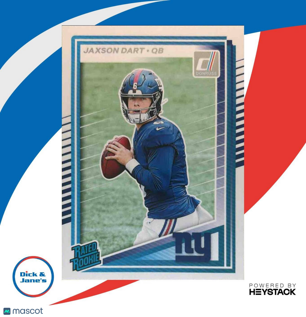 The 2025 Panini Donruss Jaxson Dart Rated Rookie #400 RC NFL card features exciting rookie Jaxson Dart from the New York Giants. This highly collectible card is a must-have for any football fan and is sure to become a valuable addition to any sports trading card collection. Don't miss out on the opportunity to own this limited edition card! Listed With Mascot.
