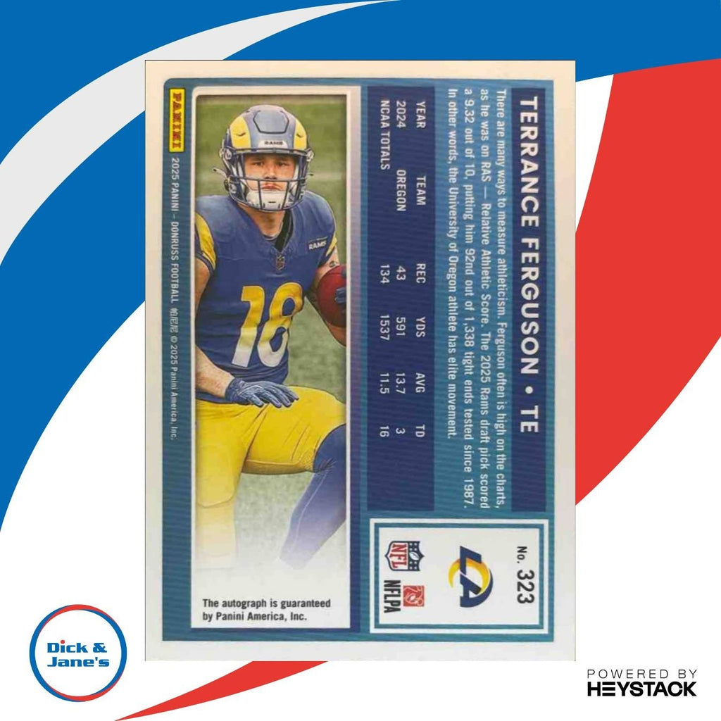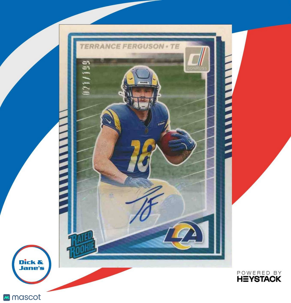 This 2025 Panini Donruss Terrance Ferguson Rated Rookie Auto card features a hand-signed autograph and is numbered 21/199. A must-have for any sports card collector or fan of the young basketball star. Add this rare RC Auto card to your collection now! Listed With Mascot.
