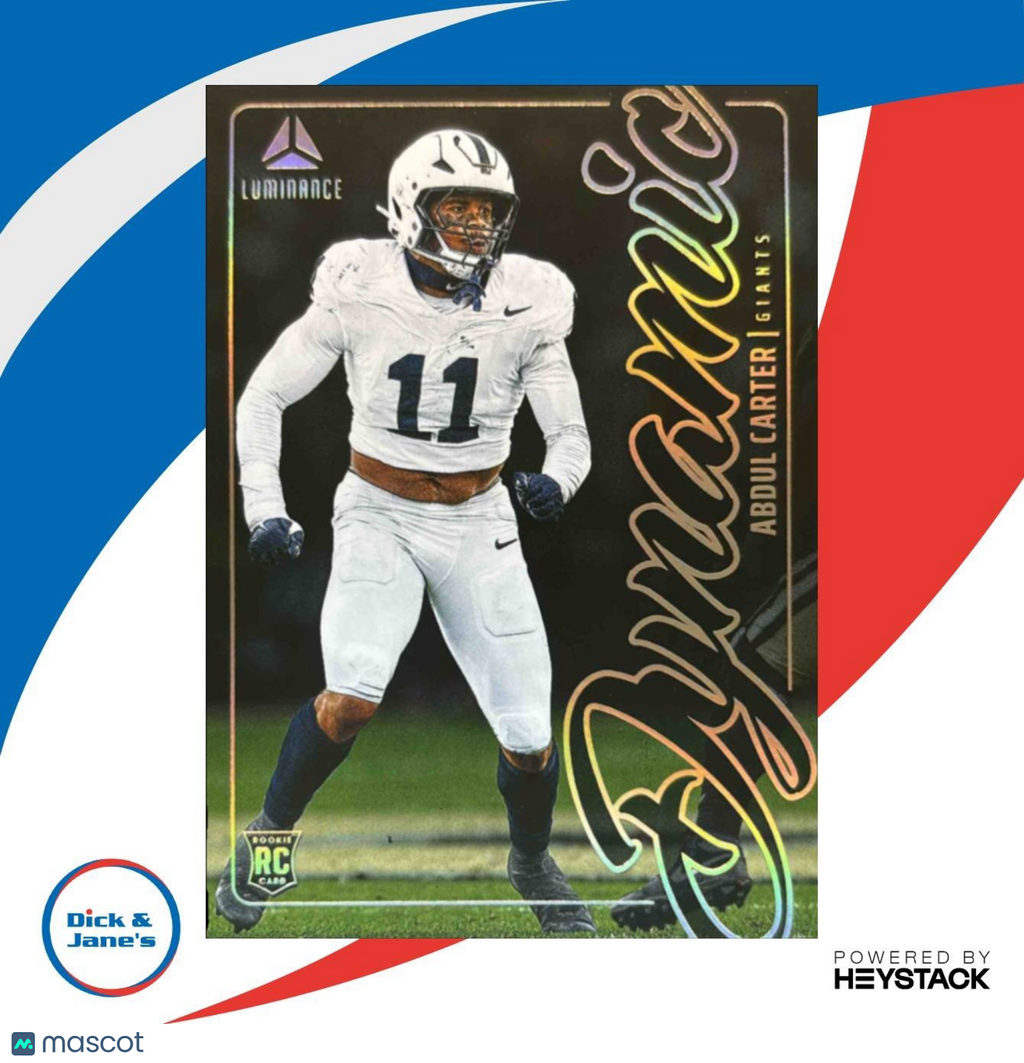 Get your hands on the 2025 Panini Luminance Abdul Carter Dynamic Rookies #12 trading card featuring the up-and-coming star from the New York Giants. This NFL card captures Carter's explosive talent and potential in a sleek and vibrant design. A must-have for any football card collector or Giants fan! Listed With Mascot.