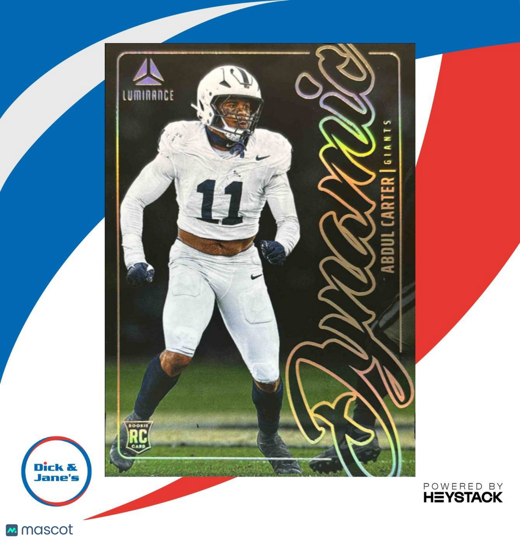 This exciting 2025 Panini Luminance Abdul Carter Dynamic Rookies #12 New York Giants trading card is a must-have for any NFL fan or collector! Featuring a standout rookie player from the Giants, this card is sure to be a valuable addition to your collection. Don't miss out on owning a piece of sports history! Listed With Mascot.