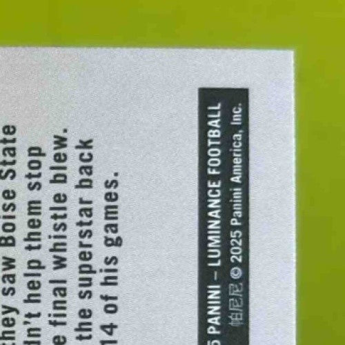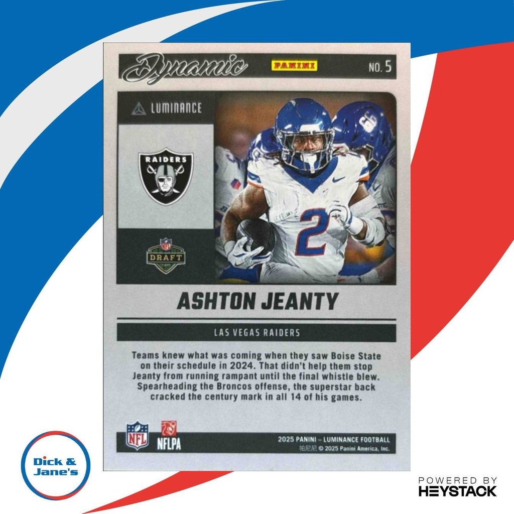This 2025 Panini Luminance trading card features rising star Ashton Jeanty of the Las Vegas Raiders. As part of the Dynamic Rookies series, this card showcases Jeanty's potential and talent on the football field. A must-have for any collector or Raiders fan looking to add a valuable piece to their collection. Order now to secure your piece of NFL history! #RaiderNation #NFL #AshtonJeanty Listed With Mascot.