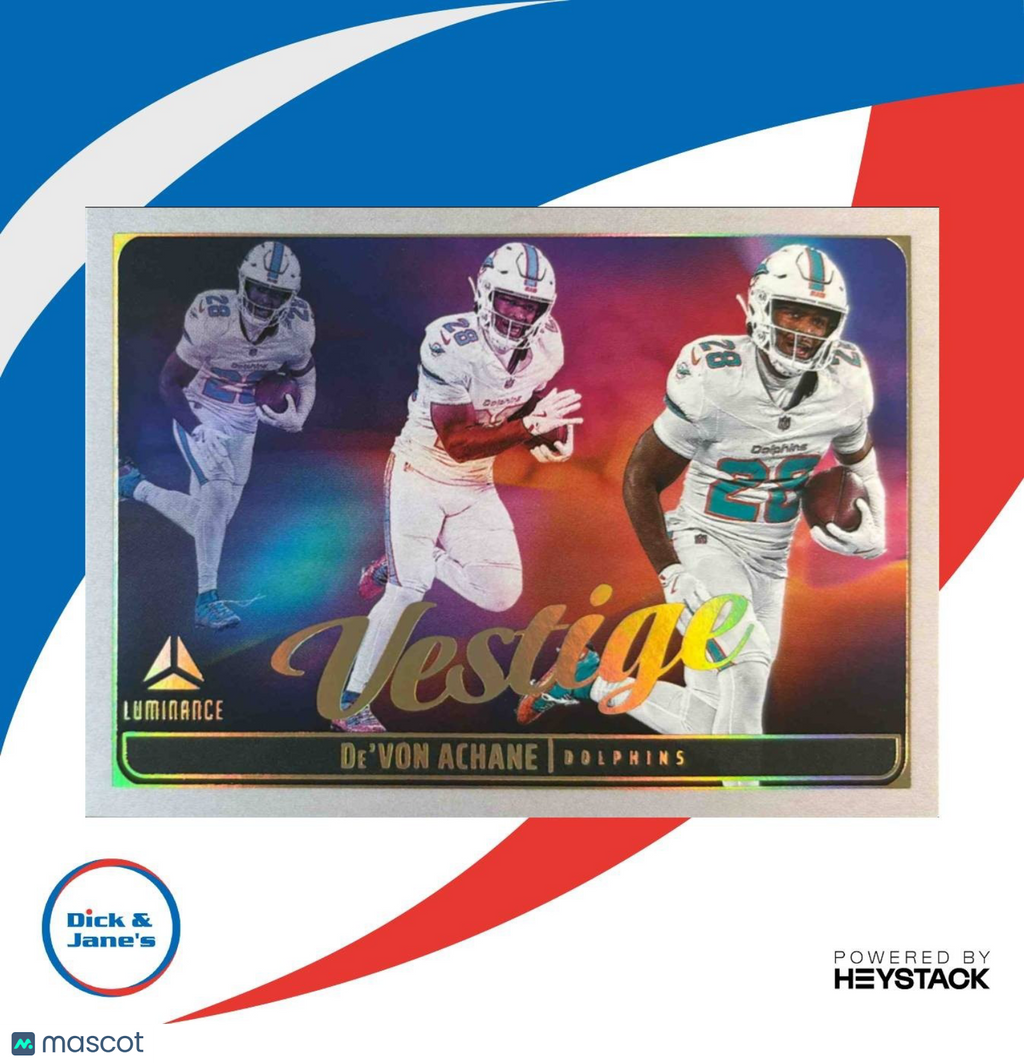 This limited edition 2025 Panini Luminance De'Von Achane Vestige #3 Miami Dolphins trading card is a must-have for any NFL collector. Featuring stunning artwork, a rare vestige design, and a standout player like De'Von Achane, this card is sure to be a prized possession for any football fan. Don't miss your chance to own a piece of sports history! Listed With Mascot.