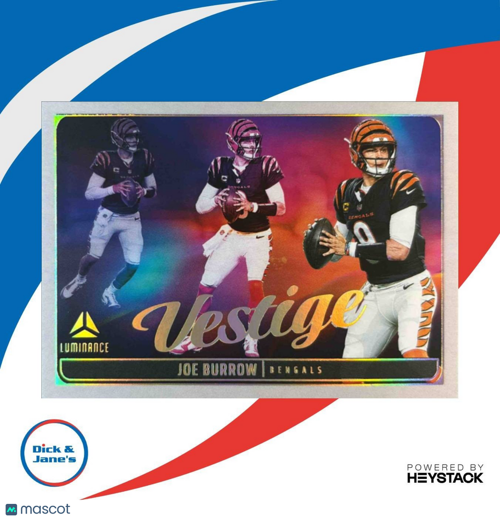 2025 Panini Luminance Joe Burrow Vestige #13 Cincinnati Bengals sports trading card features a stunning design capturing the essence of the Cincinnati Bengals quarterback. This collectible card is a must-have for fans and collectors, showcasing Burrow in action with the Bengals. Own a piece of NFL history with this limited edition card. Listed With Mascot.