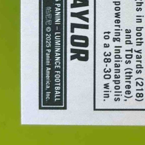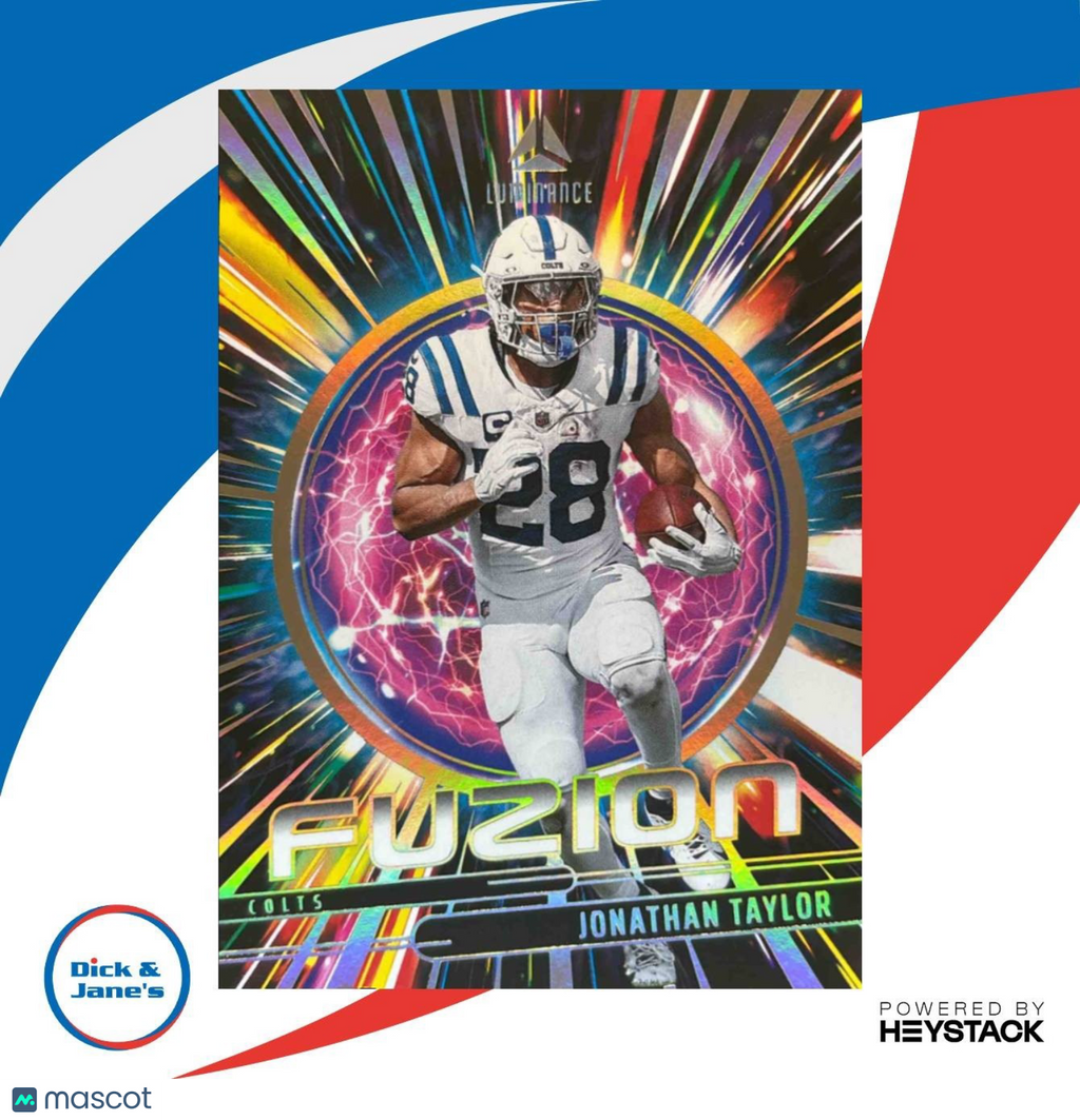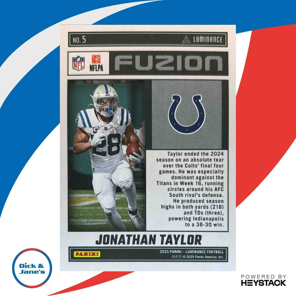 Collect the exciting 2025 Panini Luminance Jonathan Taylor Fuzion #5 trading card featuring the Indianapolis Colts star running back! This NFL card showcases Taylor in action with stunning photography and a unique Fuzion design. A must-have for any football card collector! Listed With Mascot.