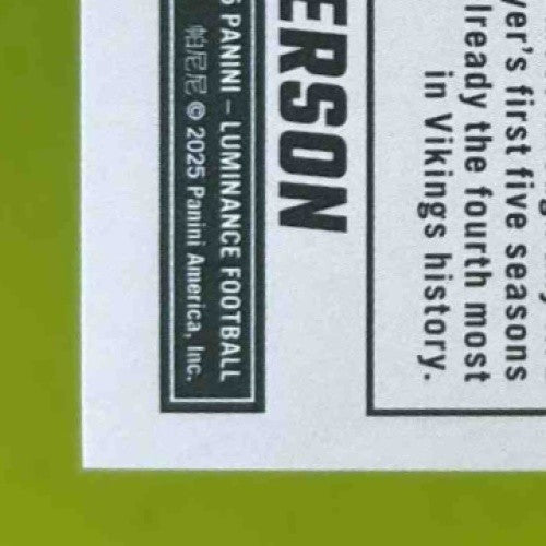 Check out this high-quality 2025 Panini Luminance Justin Jefferson Fuzion #10 trading card featuring the Minnesota Vikings star player. A must-have for any NFL fan or collector, this card showcases Jefferson in action with vibrant colors and intricate details. Add this rare piece to your collection today! Listed With Mascot.