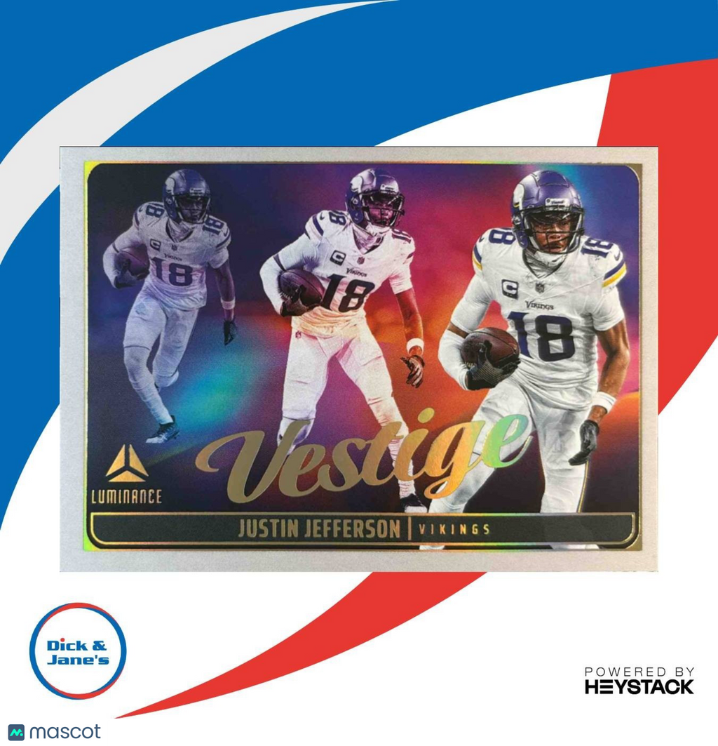 This 2025 Panini Luminance Justin Jefferson Vestige #17 Minnesota Vikings card celebrates the standout wide receiver with a stunning design and high-quality printing. A must-have for any Minnesota Vikings fan or NFL card collector looking to add a rare and valuable piece to their collection. Listed With Mascot.
