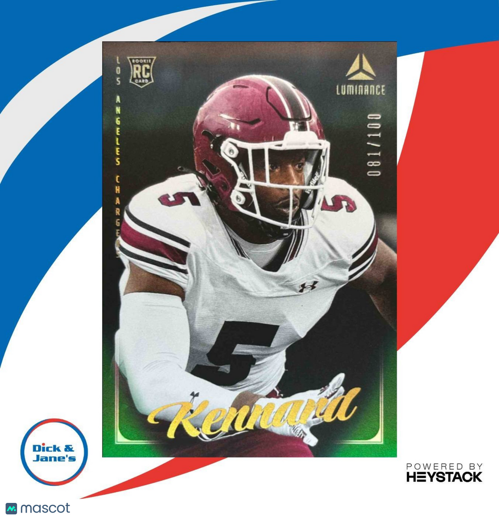 Get your hands on this rare 2025 Panini Luminance Kyle Kennard Green #159 RC sports trading card featuring the promising rookie from the Los Angeles Chargers. Limited to only 100 copies, this NFL card is a must-have for any collector. Don't miss out on your chance to own a piece of sports history! Listed With Mascot.