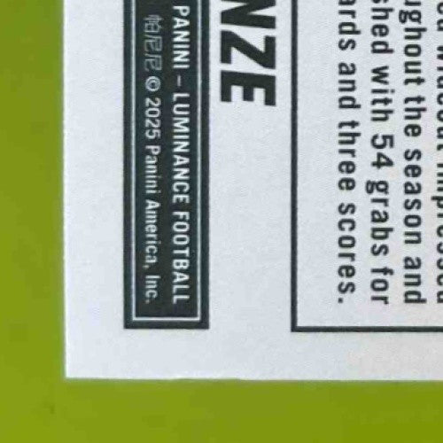 This rare 2025 Panini Luminance Rome Odunze Fuzion #7 Chicago Bears trading card features a dynamic design, limited edition Fuzion variant, and a standout photo of the NFL star in action. A must-have for any football card collector or Chicago Bears fan. Don't miss out on adding this unique piece to your collection. Listed With Mascot.