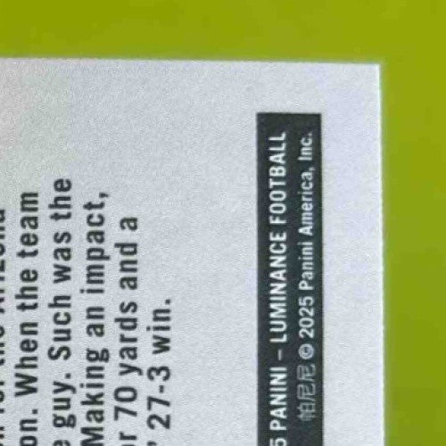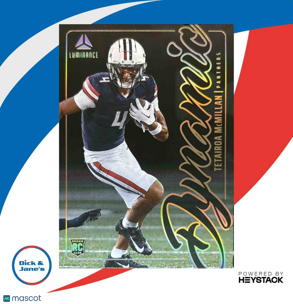 The 2025 Panini Luminance Tetairoa McMillan Dynamic Rookies #3 card features the rising star from the Carolina Panthers. This NFL card showcases McMillan's dynamic skills and potential as a young player in the league. A must-have for any football card collector wanting to own a piece of future greatness. Listed With Mascot.