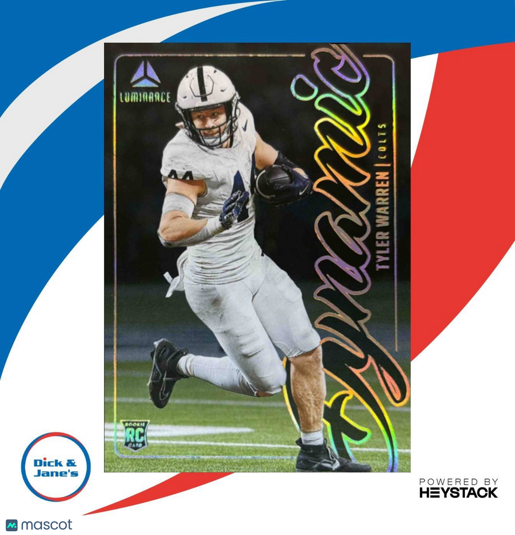 This 2025 Panini Luminance Tyler Warren Dynamic Rookies #9 card showcases a standout rookie from the Indianapolis Colts. With vibrant colors and a dynamic design, this rare NFL trading card is a must-have for collectors. Get your hands on this future star's card today! Listed With Mascot.