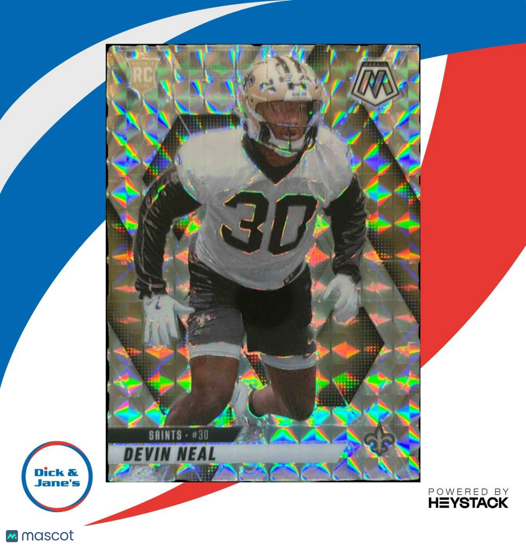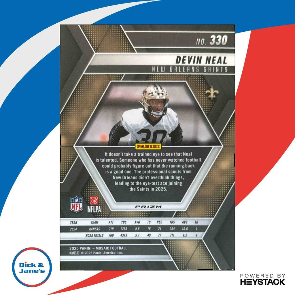 This 2025 Panini Mosaic Devin Neal Rookies Mosaic Prizm #330 RC trading card is a must-have for any New Orleans Saints fan. Featuring the rookie player in stunning mosaic prizm design, this collectible card is a valuable addition to any sports card collection. Get yours today! Listed With Mascot.