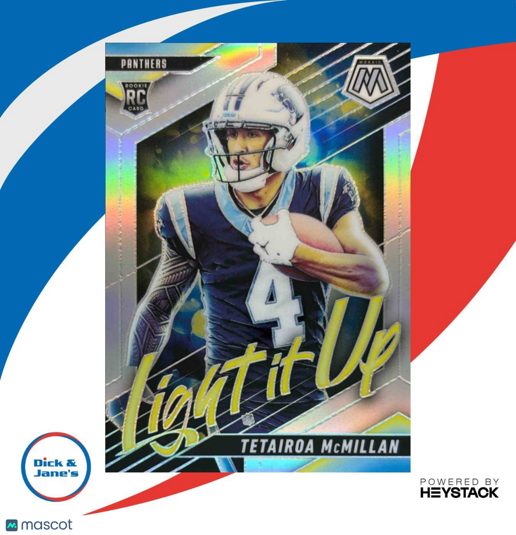 Add this rare 2025 Panini Mosaic Tetairoa McMillan Light it Up Silver #24 RC Carolina Panthers trading card to your collection! Featuring an exclusive rookie card design, this NFL card showcases the rising star's talent in stunning silver. A must-have for any fan or collector. Listed With Mascot.