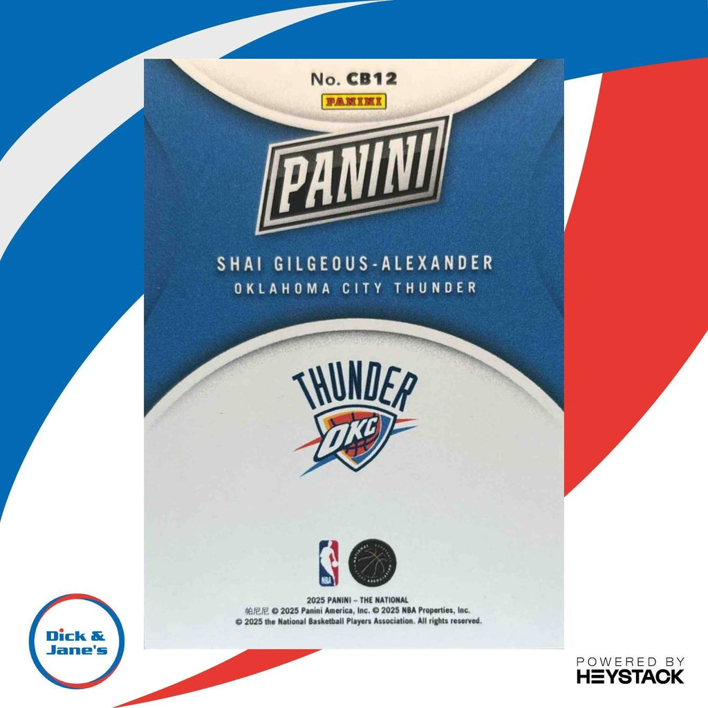 This 2025 Panini NSCC Case Breaker sports trading card features NBA player Shai Gilgeous-Alexander of the Thunder. Limited to just 199 copies, this rare card is a must-have for any basketball card collector. Don't miss your chance to own a piece of basketball history! Listed With Mascot.