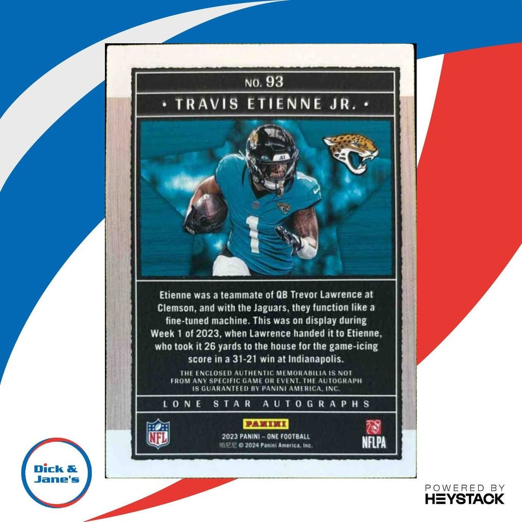 This 2025 Panini One Travis Etienne Jr. trading card features a rare Lone Star Auto NIKE Patch Red variation, limited to only 15 copies. A must-have for Jaguars fans and NFL card collectors, this unique item showcases the talented rookie in stunning detail. Don't miss out on adding this exclusive piece to your collection! Listed With Mascot.