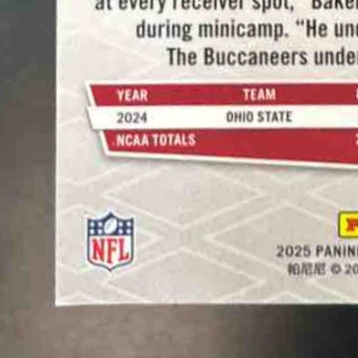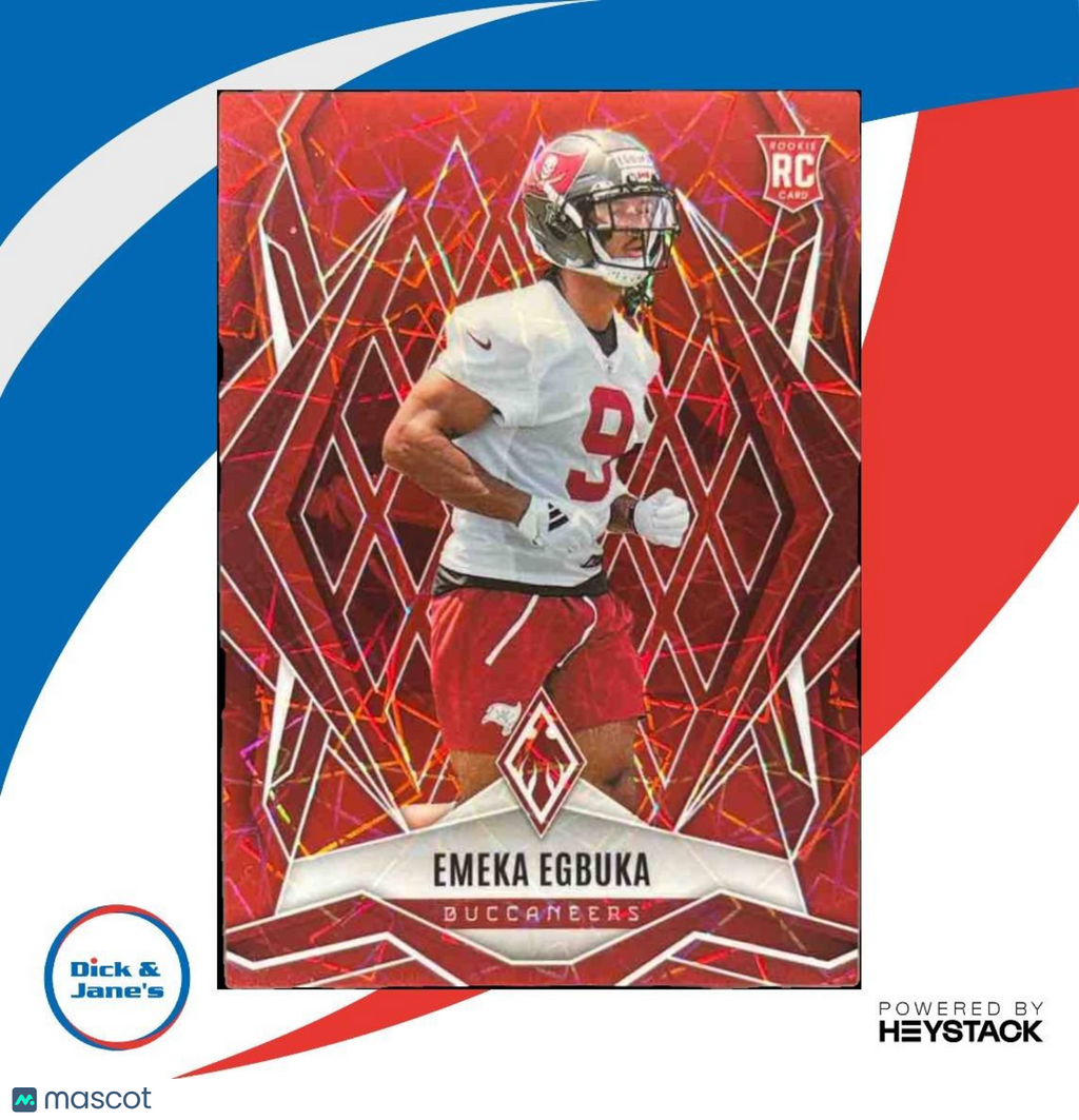 Collect this rare 2025 Panini Phoenix Emeka Egbuka Red Lazer RC trading card featuring the Tampa Bay Buccaneers rookie. Limited to just 199 copies, this card is a must-have for any football card collector. Don't miss out on adding this unique and valuable piece to your collection today! Listed With Mascot.