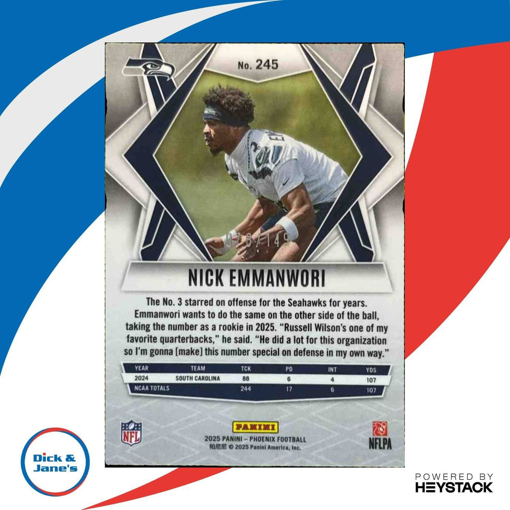 2025 Panini Phoenix Nick Emmanwori Green Winter 8/149 #245 RC Seattle Seahawks trading card. Highly collectible rookie card featuring rising NFL star Nick Emmanwori. Limited edition, only 149 produced. Perfect for any Seahawks fan or sports card enthusiast. Get your hands on this rare and exclusive card today! Listed With Mascot.