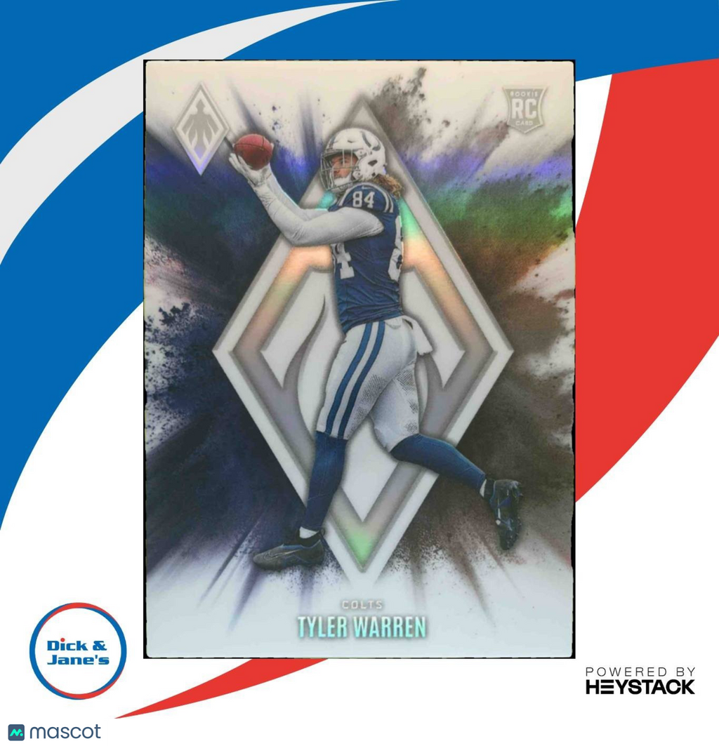 The 2025 Panini Phoenix Tyler Warren Color Blast #2 RC SSP Indianapolis Colts sports trading card is a rare and highly sought-after item for any NFL fan. Featuring a stunning color-blast design and rookie card status, this card is a must-have for collectors looking to add a unique and valuable piece to their collection. Don't miss out on the chance to own this special card! Listed With Mascot.
