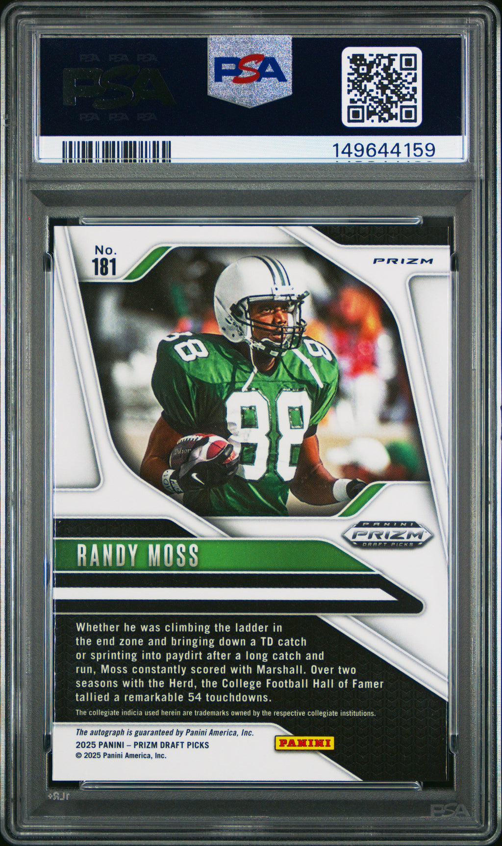 2025 Panini Prizm Draft Picks Randy Moss Autograph Silver #181 PSA 10 Marshall Thundering Herd 🌟 Calling all football card collectors and Randy Moss fans! This ultra-rare 2025 Panini Prizm Draft Picks Autograph Silver parallel features the legendary Hall of Famer Randy Moss during his iconic Marshall Thundering Herd days. Professionally graded PSA 10—there’s no higher-graded example in existence (Population 1, none higher)! This card is autographed by Moss himself, making it a true centerpiece for any serious collection and a must-have for those seeking the ultimate in modern football rookie memorabilia. 🔥 Secure this one-of-a-kind gem with confidence, as it comes authenticated by Professional Sports Authenticator (PSA) with certification number 149644159. With zero population higher and only one in existence, this is your chance to own a piece of 2025 football history—perfect for investment or display. Don’t miss out on adding this exclusive Marshall Thundering Herd treasure to your collection! Autographed: Yes Set: 2025 Panini Prizm Draft Picks Signed By: Randy Moss Certification Number: 149644159 Grader: Professional Sports Authenticator (PSA) Player/Athlete: Randy Moss Grade: 10 Year Manufactured: 2025 Graded: Yes Sport: Football Population Higher: 0 Parallel/Variety: Autograph Silver Manufacturer: Panini Population: 1 Team: Marshall Thundering Herd Card Number: 181 Listed With Mascot.