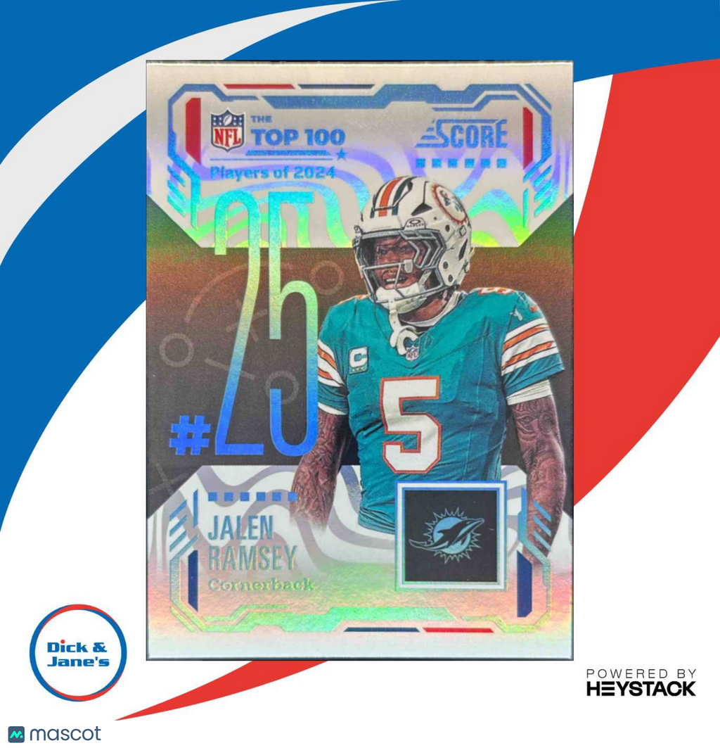 2025 Panini Score Jalen Ramsey Top 100 #25 Miami Dolphins Listed With Mascot.