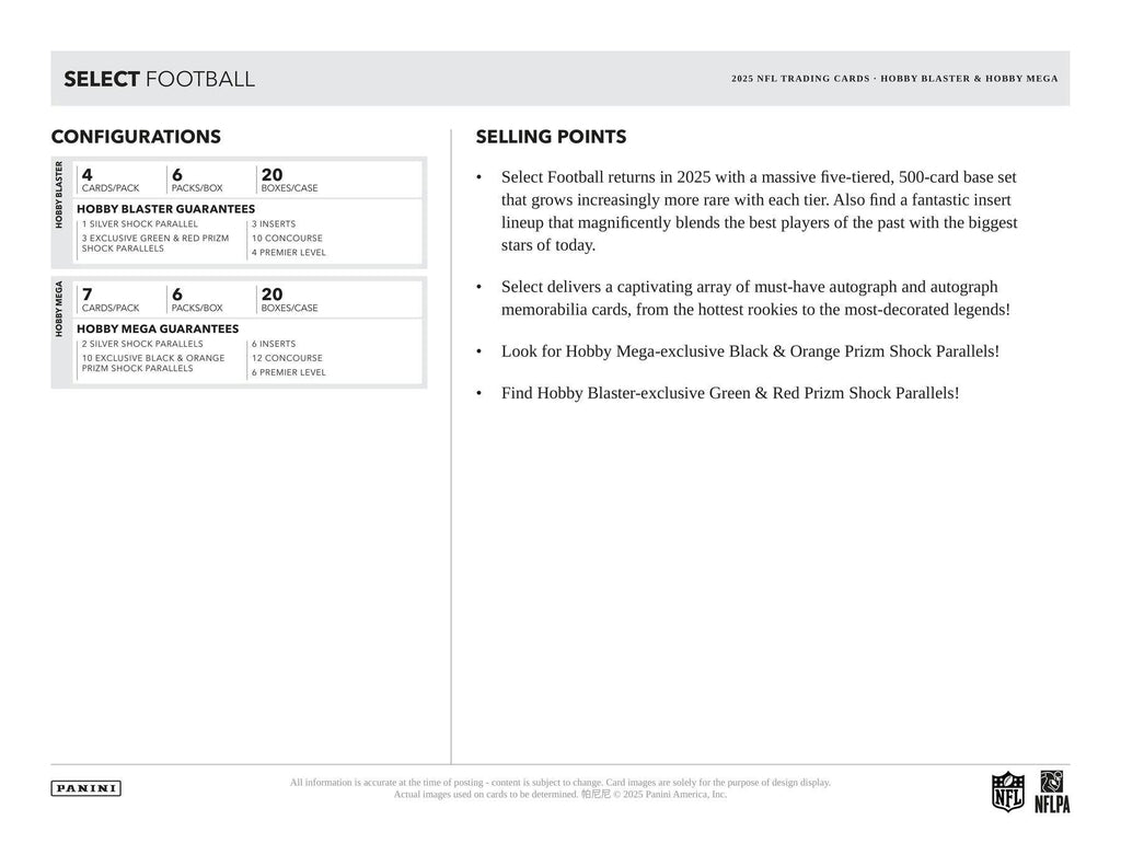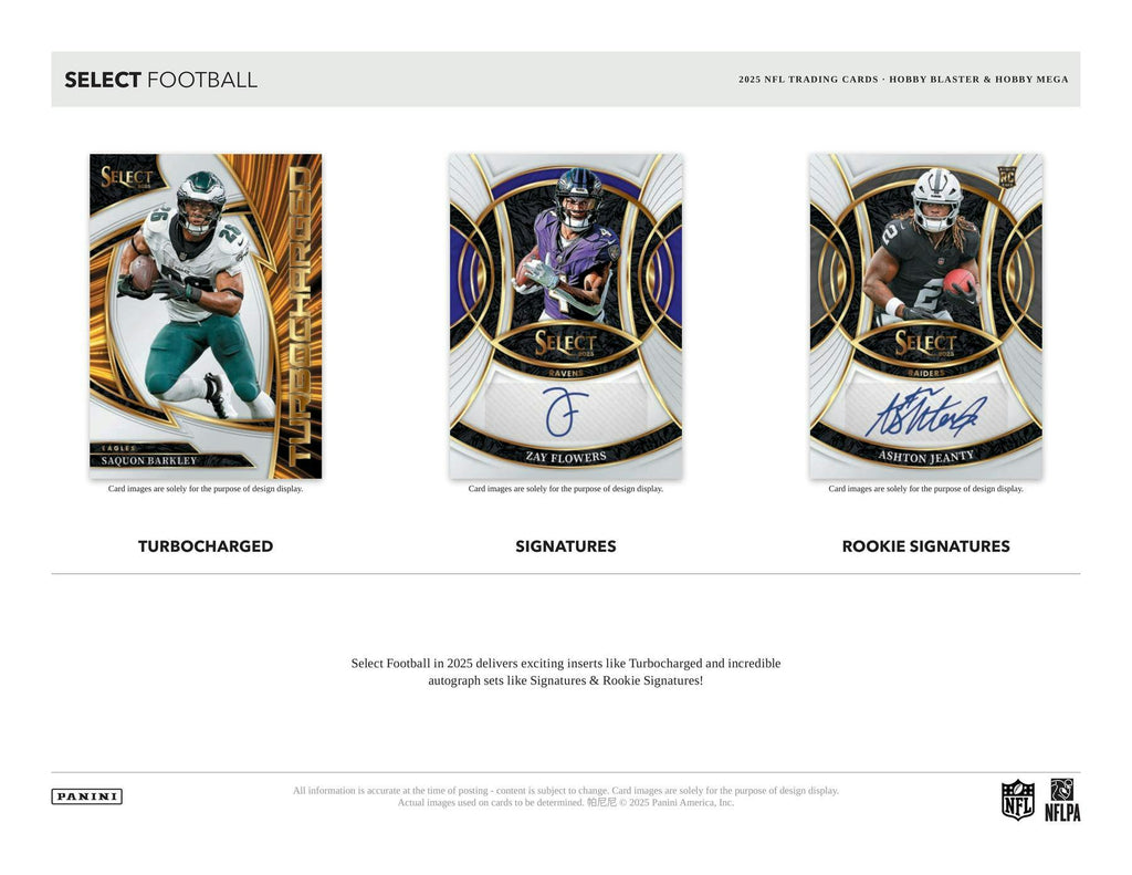 Select Football returns in 2025 with a massive five-tiered, 500-card base set that grows increasingly more rare with each tier. Also find a fantastic insert lineup that magnificently blends the best players of the past with the biggest stars of today.