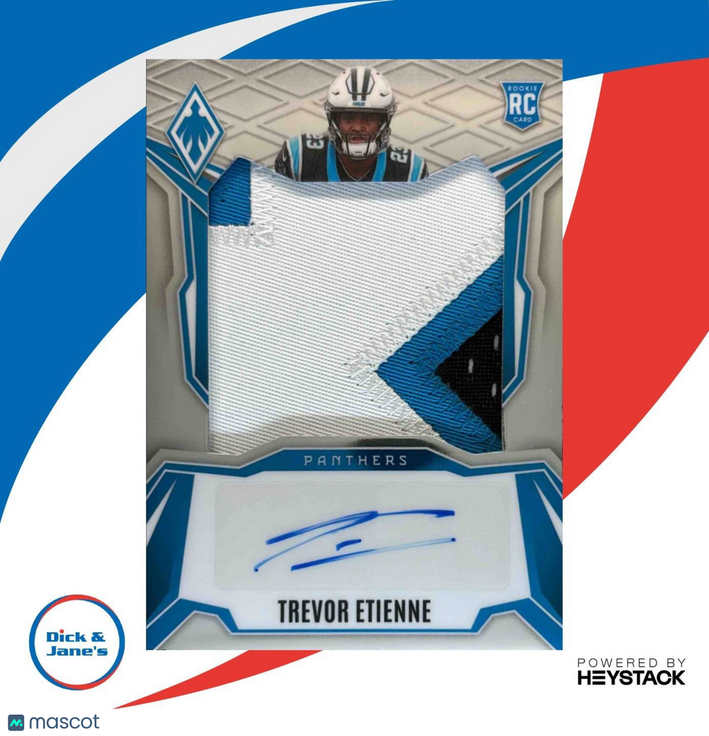 Get your hands on the highly sought-after 2025 Phoenix Trevor Etienne RC Auto Patch Tri Color /199 Carolina Panthers trading card. This NFL rookie card features a rare autograph and patch, limited to only 199 copies. Don't miss out on adding this future star's card to your collection! Listed With Mascot.