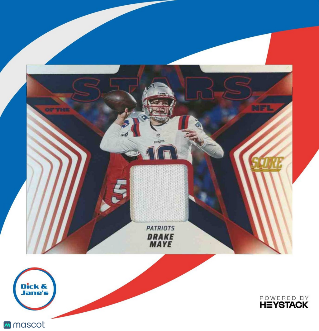 This limited edition 2025 Score Drake Maye Stars of the NFL trading card features a jersey relic from the rising star quarterback of the New England Patriots. Own a piece of history with this exclusive memorabilia card showcasing Maye's talents on the field. Add it to your collection today! #NFL #TradingCard #NewEnglandPatriots Listed With Mascot.