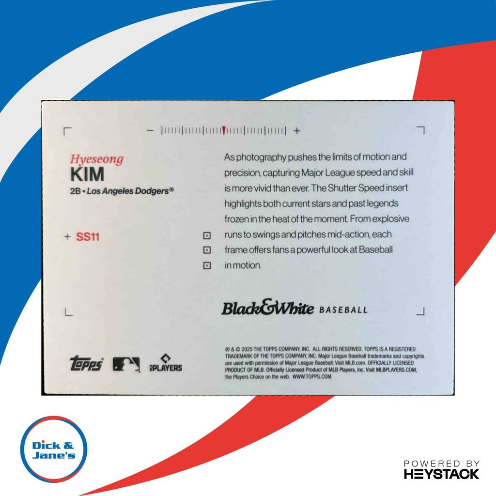 The 2025 Topps Black and White Hyeseong Kim Shutter Speed #SS11 RC trading card is a must-have for any sports card collector. Featuring a stunning black and white design, this rookie card captures Kim in action with incredible detail. Don't miss your chance to own this rare and unique piece of memorabilia. Listed With Mascot.