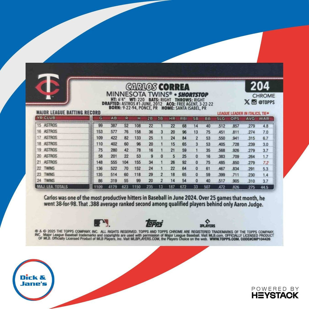 Add this rare and stunning 2025 Topps Chrome Carlos Correa Orange Geometric Refractor /25 #204 Twins trading card to your collection today! Limited to only 25 copies, this MLB card features a unique design that will surely stand out. A must-have for any baseball card enthusiast. Grab yours now before it's gone! Listed With Mascot.