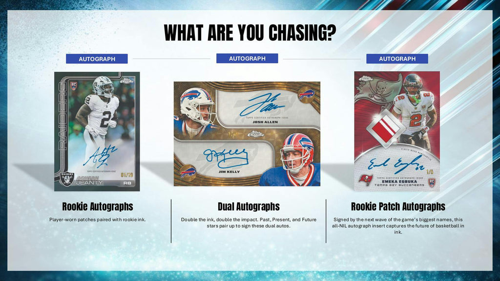 Where the game's biggest names meet iconic Chrome shine. Featuring a dynamic mix of rookies, superstars, and legends, these coveted autographs are amplified by the full Chrome rainbow-including ultra-rare, low-numbered parallels built for the ultimate chase. Look for signatures from Tom Brady and Barry Sanders, current stars like Josh Allen and Jahmyr Gibbs, and rising talent such as Jaxson Dart and Tetairoa McMillan.
