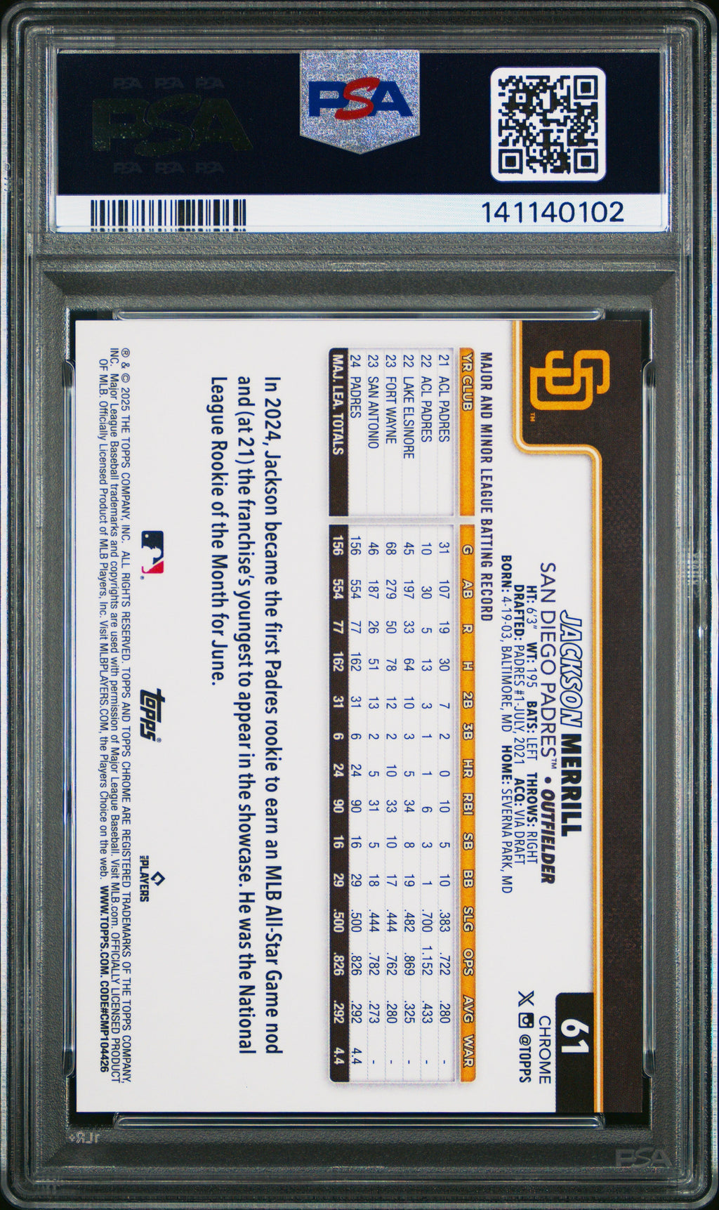 You are purchasing the following: 2025 Topps Chrome Jackson Merrill Gold Wave 20/50 #61 PSA 9 San Diego Padres. You will receive the exact item in the photographs. Note: Please do not connact us and asking the following: 1. What is the lowest you would take? Just make an offer. If the offer is automatically declined, you have your answer. 2. What the best you can do? See above. Not repling to an email is a reply. 3. Any room on this? See above. Not repling to an offer is a reply. 4. We ONLY do one counter offer, so please make your best offer the first time! Note: If the price off, in your option, please send your resaoning and an offer. We will review it. Note: We manage nearly 10 millon cards regularly and will adjust prices as errors are noticed or pointed out! Listed With Mascot.
