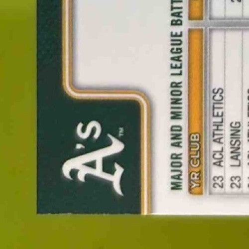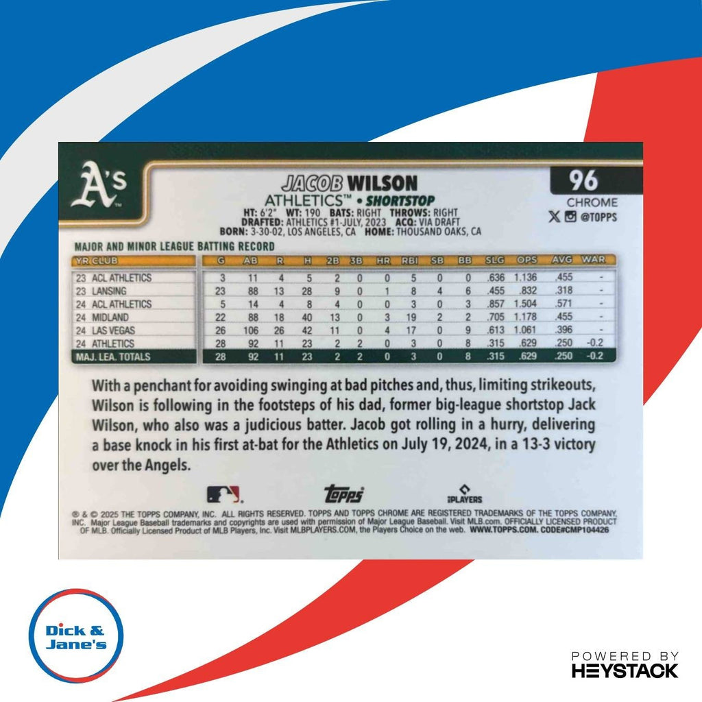 This 2025 Topps Chrome Jacob Wilson Prism Refractor #96 RC trading card featuring the Oakland Athletics is a must-have for any MLB collector. This rookie card showcases Wilson in stunning detail and is a valuable addition to any sports card collection. Don't miss out on this rare and highly sought-after card! Listed With Mascot.