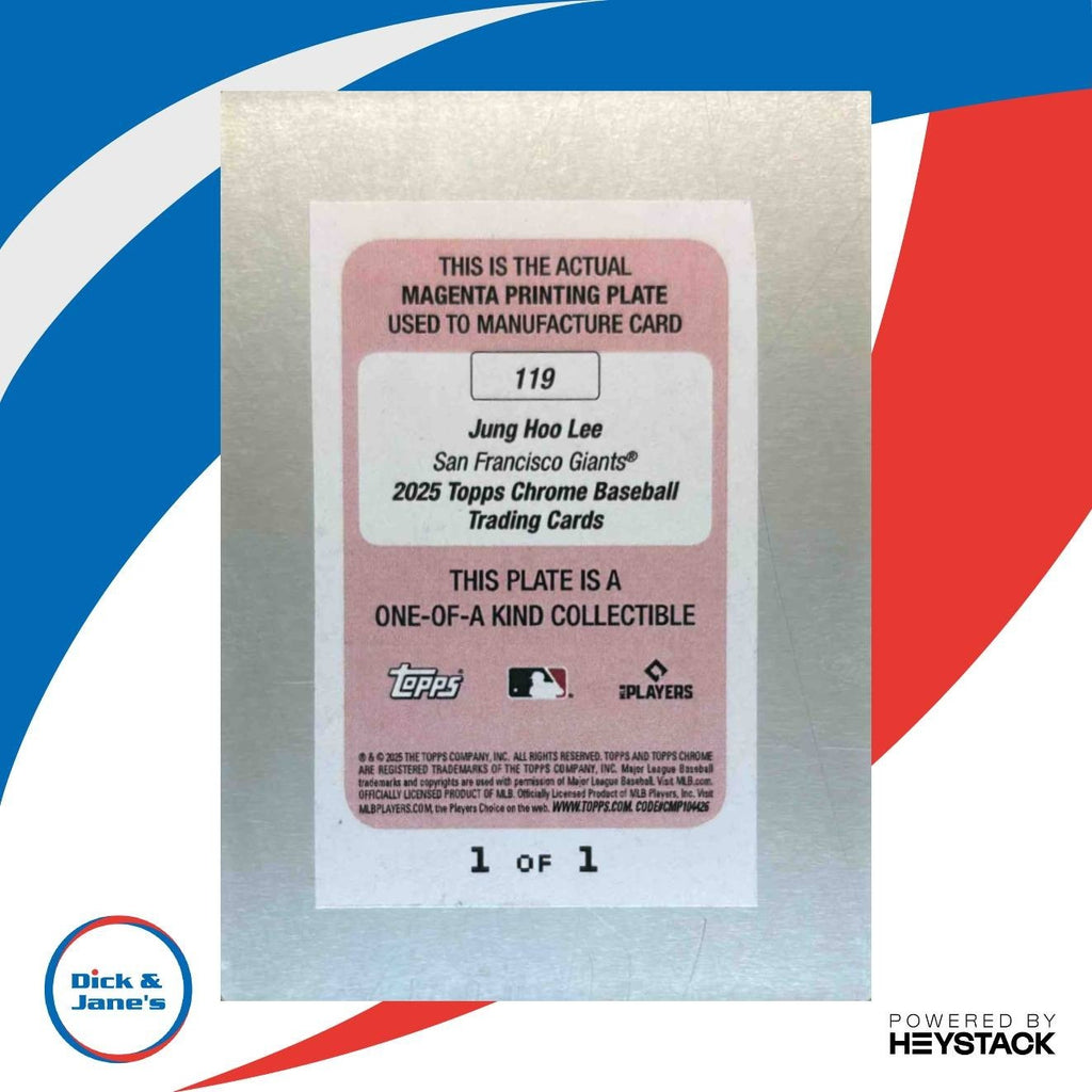 . Own a piece of baseball history with this 2025 Topps Chrome Jung Hoo Lee #119 PRINTING PLATE MAGENTA 1/1 ONE OF ONE Giants trading card. This one-of-a-kind card features a stunning design and is a must-have for any collector. Don't miss your chance to add this rare gem to your collection! Listed With Mascot.